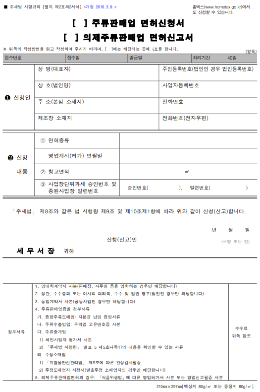 - 주정도매업자의 지정서(발효주정소매면허에 한함)