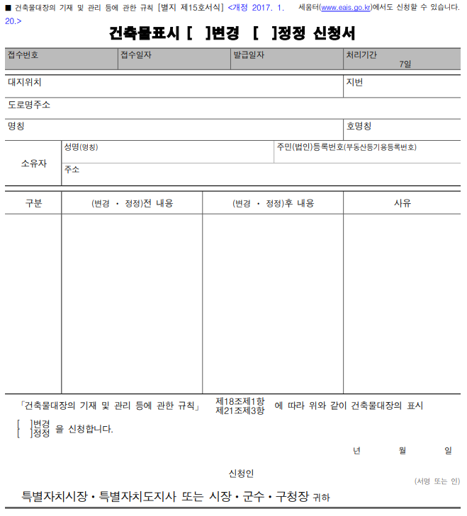 5. '건축물표시 변경신청서'를 작성하여, '건축물 현황도', '건축물의 표시에 관한 사항이 변경되었음을 증명하는 서류'를 첨부하여 지자체에 신고를 합니다.(관할 시, 군, 구청)