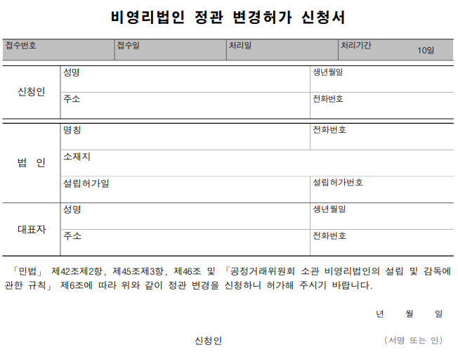 정관을 변경하고자 하는 법인은 주무관청에 정관변경 허가신청서 및 그 밖의 서류들을 제출해야하며, 주무관청별로 다소 차이가 있으니 사전 문의하고 처리하는 것이 좋을듯 합니다.